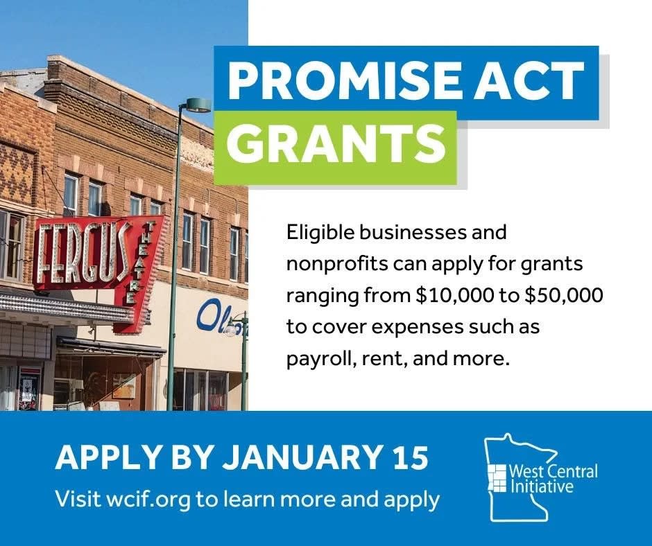 West Central Initiative (WCI) is accepting applications from businesses and non-profits for PROMISE Act Grants of up to $50,000. Grant funds can be used for working capital to support payroll expenses, rent or mortgage payments, utility bills, equipment, and other similar expenses that occur in the regular course of business.